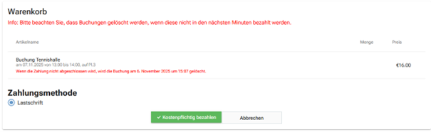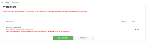 Nach Auswahl der Daten wird die Buchung zunächst im System vorgemerkt. Sofern die Bezahlung nicht in den nächsten Minuten vorgenommen wird, werden die Buchungen wieder automatisch gelöscht.